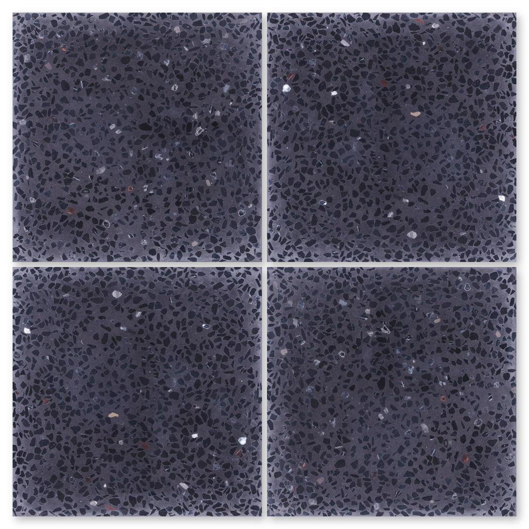 Our terrazzo has a honed, matte surface with beveled edges, showcasing the natural variation of each piece.