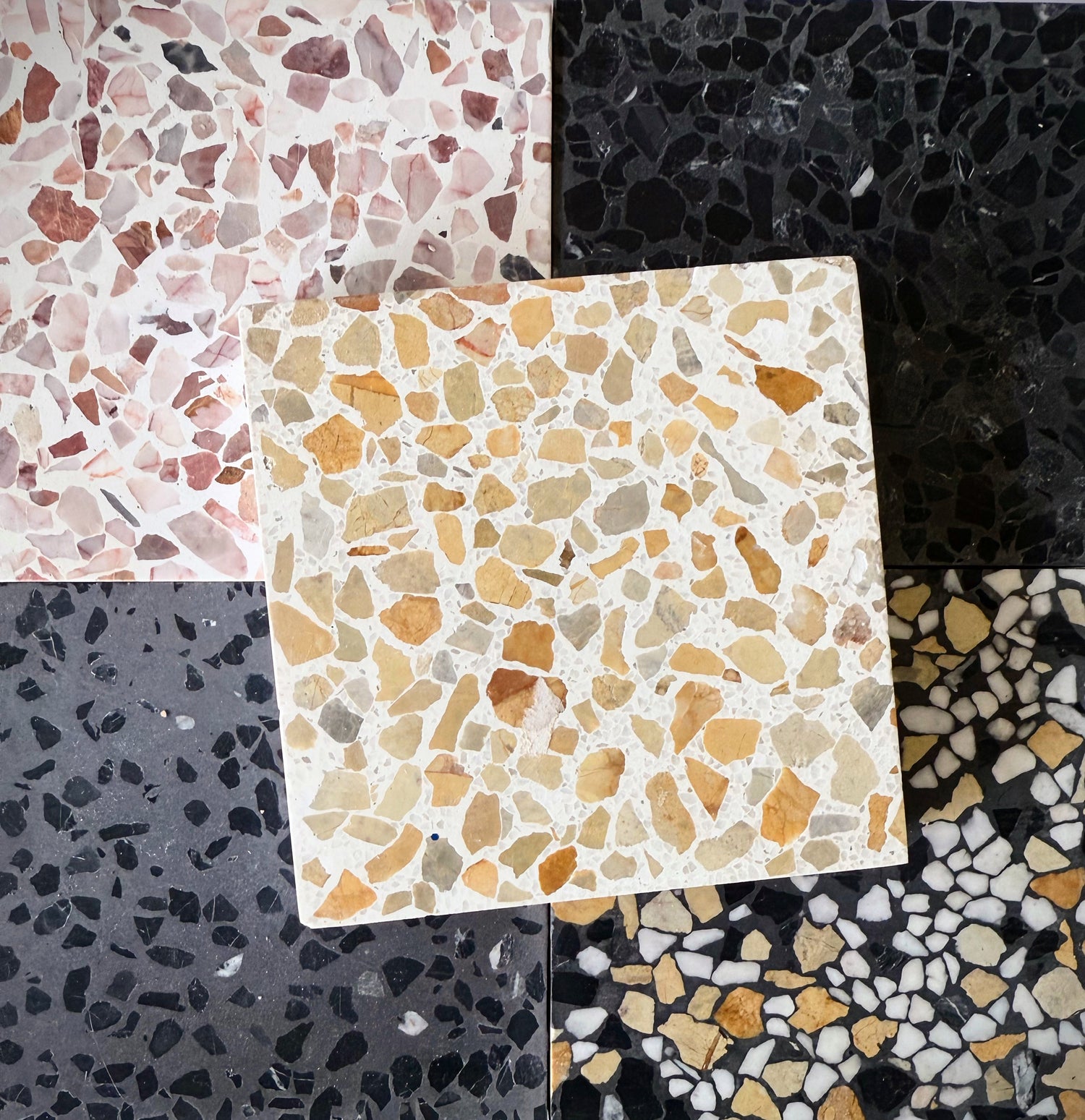 Our terrazzo has a honed, matte surface with beveled edges, showcasing the natural variation of each piece.
